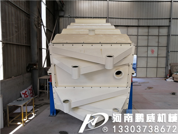 沸騰篩篩面是用氨基甲酸乙酯制造,堅韌而耐磨,在運動時能產生很高的加速度,一般是重力加速度的30~50倍,使粘性很強和容易堵孔的粉狀物料,能充分透篩。其寬度為250mm,然后伸直,其伸縮量為24mm,是曲軸偏心距的4倍。沸騰篩的結構,外側篩框和內側篩框,借助于中間導向彈簧板,分別安裝在機架上,氨基甲酸乙酯篩面安裝于篩框的橫板上,橫板相互交錯安裝。內外兩個篩框,由曲軸傳動作相對振動時,橫板也隨之一起振動,實現篩面的沸騰運動。采用雙組側板電機激振器由偏心塊同步旋轉共振帶動彈性聚氨酯篩板產生波浪弛張振動的圓彈躍運動和直線彈躍運動,篩面傾角一般為15-25°篩板由兩端活動梁固定,配合剪切彈簧和板簧產生高振幅振動達到固定橫梁和活動橫梁對篩網的慣性力矩不斷地張弛形成一凹一凸的波浪效果達到物料良好的松散流動性同時獲得有效的物料彈躍篩分,實現篩分精度,篩分產量和防堵網的效果。