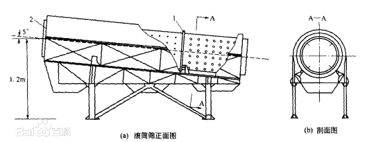 如圖是滾筒篩結構。滾筒段是通過螺母、螺釘與滾筒篩轉盤相連接的,因此滾筒段的安裝與拆卸比較方便。由于滾筒段與轉盤相連,當轉盤在驅動裝置的驅動下而發生轉動時,滾筒段也跟著一起轉動。