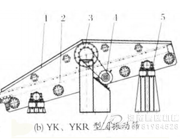 YKX稀油圓振動(dòng)篩結(jié)構(gòu):由彈簧支承組、傳動(dòng)裝置、篩箱、支承座、稀油潤(rùn)滑振動(dòng)器等組成。